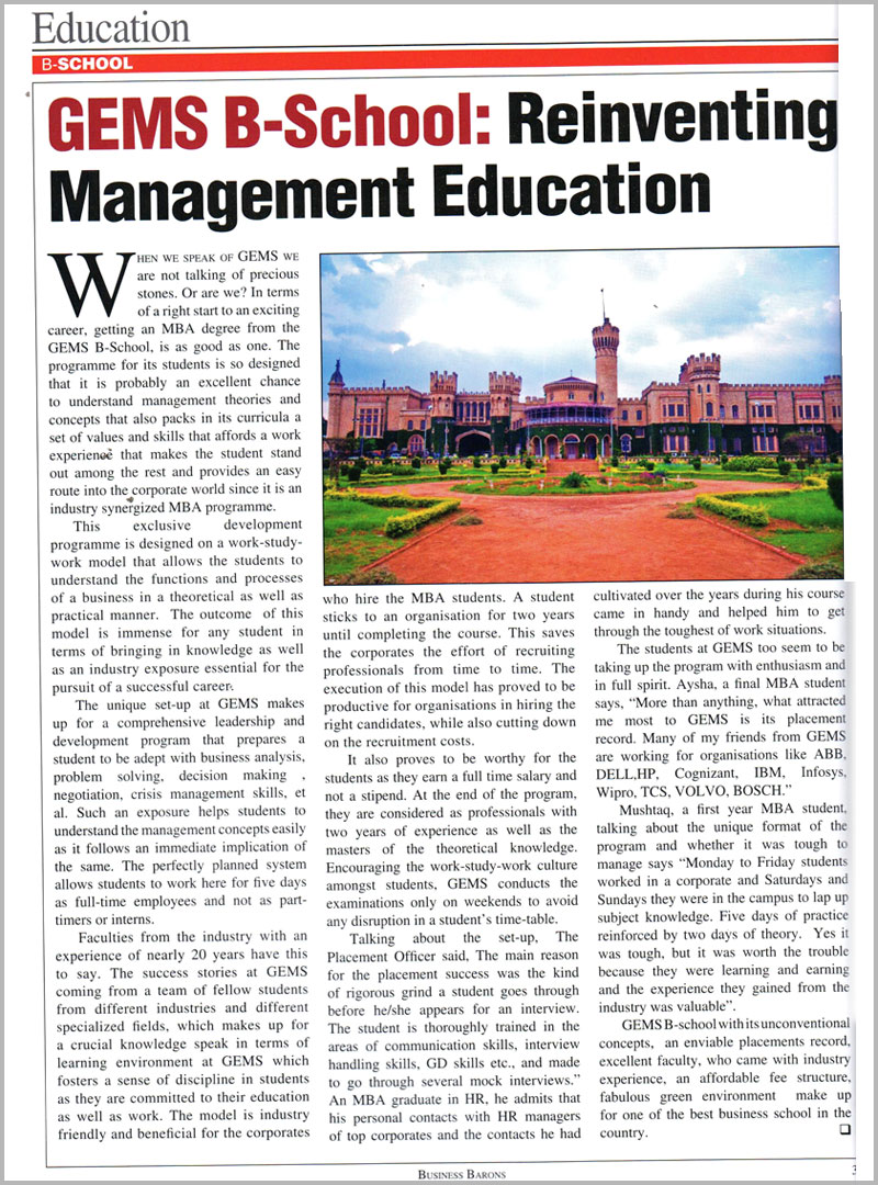 Write up in “Business Barons” on how students learn Management concepts through the first of its kind Work-Study-Work Model offered at GEMS B SCHOOL.